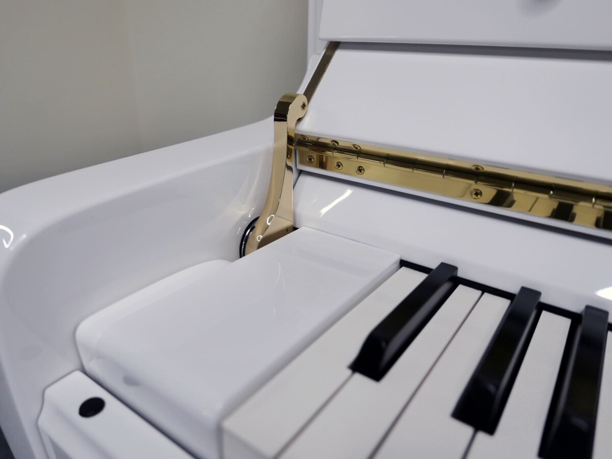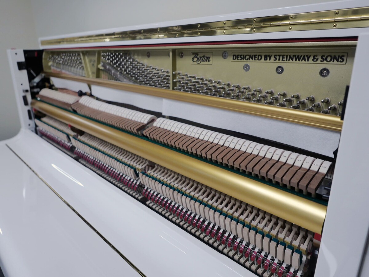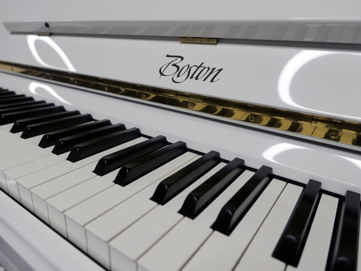 BOSTON UP-126 PE con sistema silent Genio Alpha Premium. Piano de gama profesional acabado en blanco pulido BP RAL 9003.